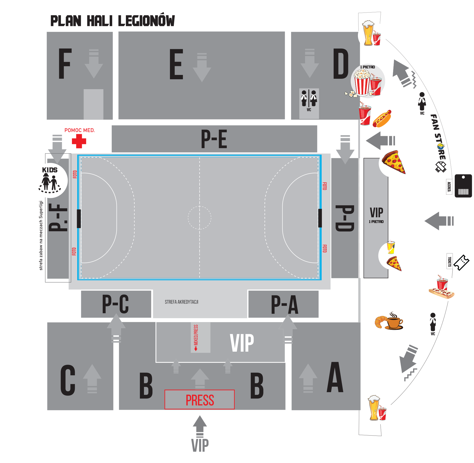 W hali tradycyjnie już znajdą się punkty gastronomiczne - kibice kupić będą mogli pizzę na kawałki oraz hot dogi. Ale też dostępne będą ciepłe i zimne napoje, popcorn oraz inne przekąski. Szczegółowa lokalizacja tych punktów znajduje się na mapie, płatność gotówką oraz kartą.